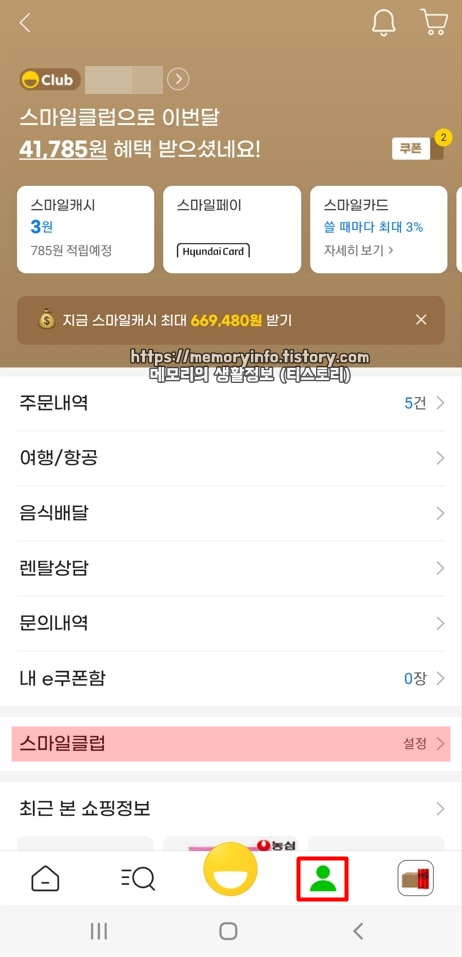 마이페이지로 이동한 후, 아래에 보이는 "스마일클럽 (설정)"을 눌러줍니다.