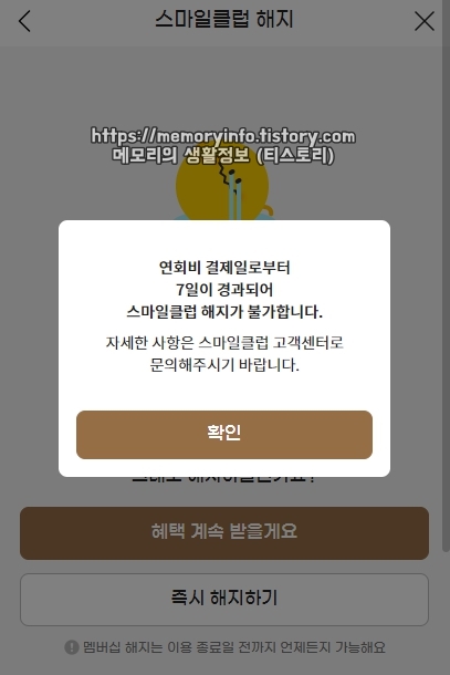 그런데 만약 연회비 결제일로부터 7일이 지났다면, 스마일클럽 해지 및 환불 신청이 불가능합니다. 연회비 자동 결제 해지 신청만 가능하죠.