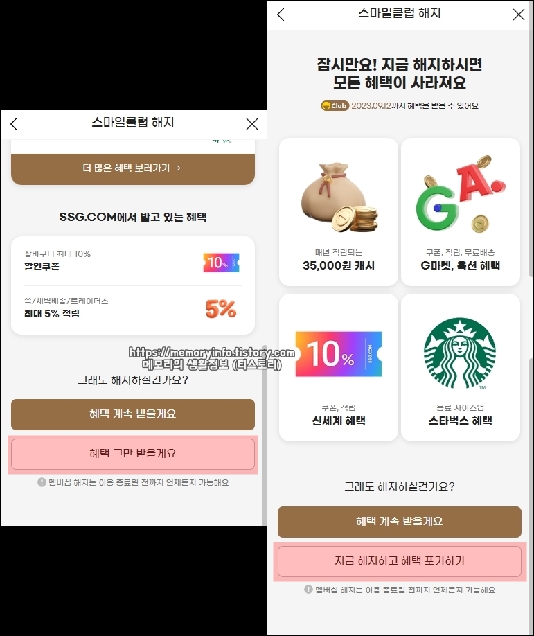 스마일클럽 해지 창 하단에 보이는 "혜택 그만 받을게요", "지금 해지하고 혜택 포기하기"를 눌러줍니다.