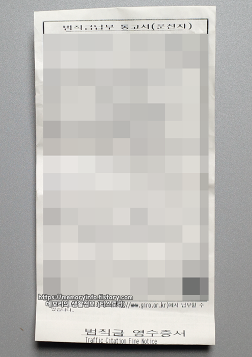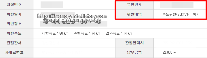위 사진은 실제로 무인 카메라를 통해 과속 단속에 걸렸을 때 납부한 과태료입니다. 20km/h 이하 과속이라 32,000원의 과태료를 맞았죠. 참고로 과태료는 벌점이 부과되지 않습니다.