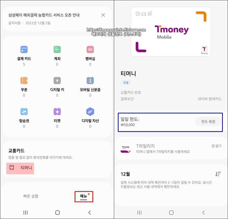 추가 완료한 모바일 티머니 카드 정보는 "삼성페이 > 메뉴 > 티머니"를 통해 확인 가능합니다.