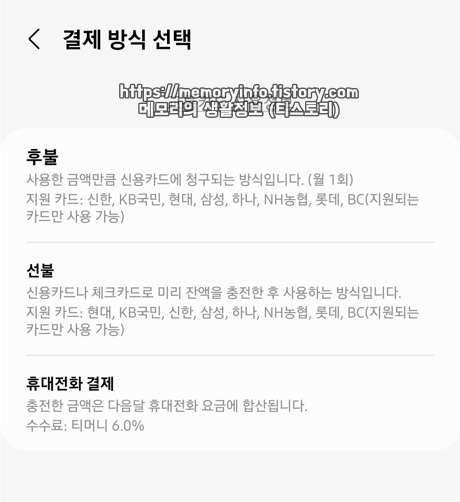 삼성페이 교통카드(티머니) 기능을 이용하면 삼성페이에 등록된 카드를 후불 교통카드(신용카드)나 선불 교통카드(신용카드 또는 체크카드)로 쓸 수도 있습니다. 추가적으로 휴대전화 결제(소액결제)로도 교통카드 기능을 이용할 수 있죠.