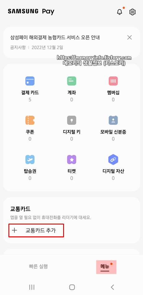 이어서 메뉴에 있는 "교통카드 추가"를 눌러줍니다.