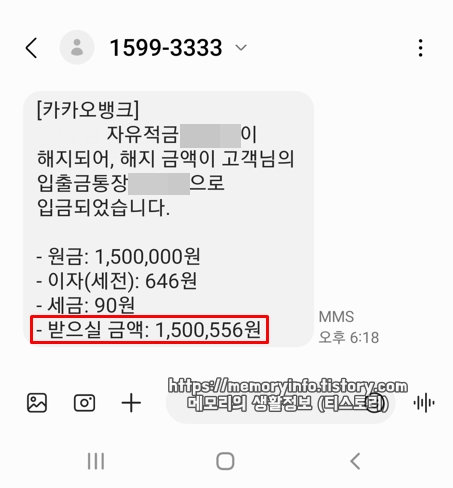 자유 적금 해지가 완료 후, 정산 금액(원금 + 중도 해지 이자)은 선택한 카카오뱅크 계좌로 즉시 입금됩니다. 그리고 해당 금액은 즉시 사용할 수 있습니다.