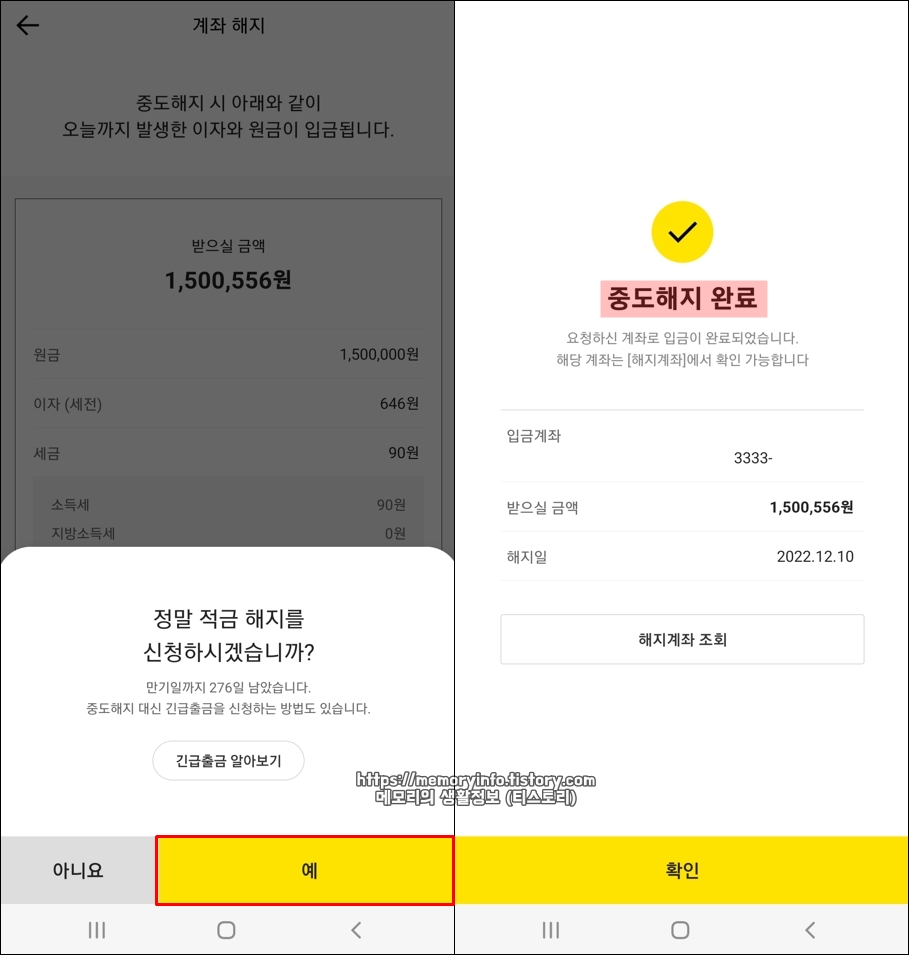 수령하게 되는 금액을 확인한 후, 이상이 없다면 아래에 "예"를 눌러줍니다. 그리고 이어서 인증 비밀번호 6자리를 입력해주면 카카오뱅크 자유적금 중도 해지가 완료됩니다.