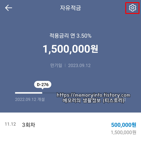 앱 실행 후, 메인 화면에서 현재 가입해서 이용 중인 자유 적금 상품을 눌러줍니다.