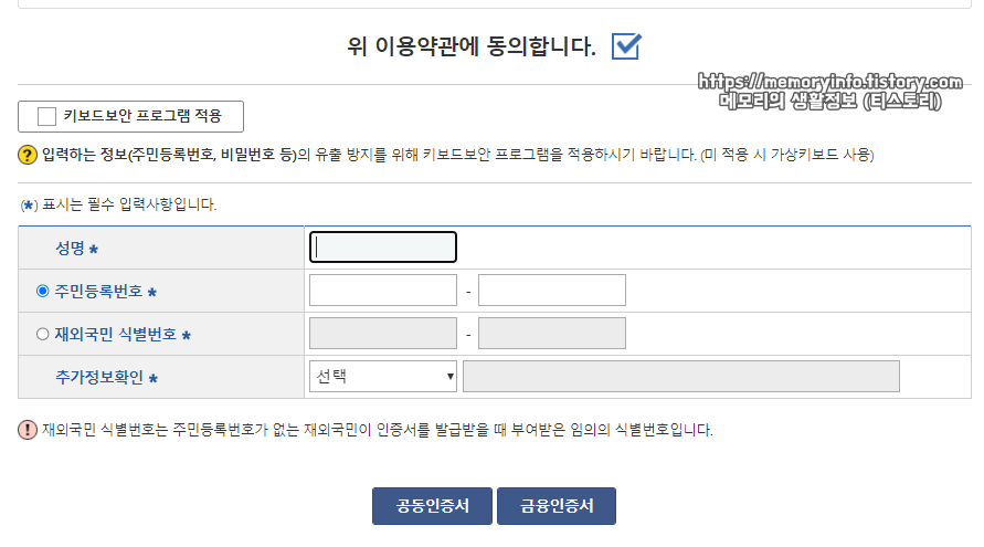 이용 약관에 동의한 후, 성명과 주민등록번호 그리고 추가 정보 확인 정보를 입력해줍니다. 모두 입력했다면, 아래에 보이는 인증 수단(공동인증서, 금융인증서)을 눌러줍니다.
