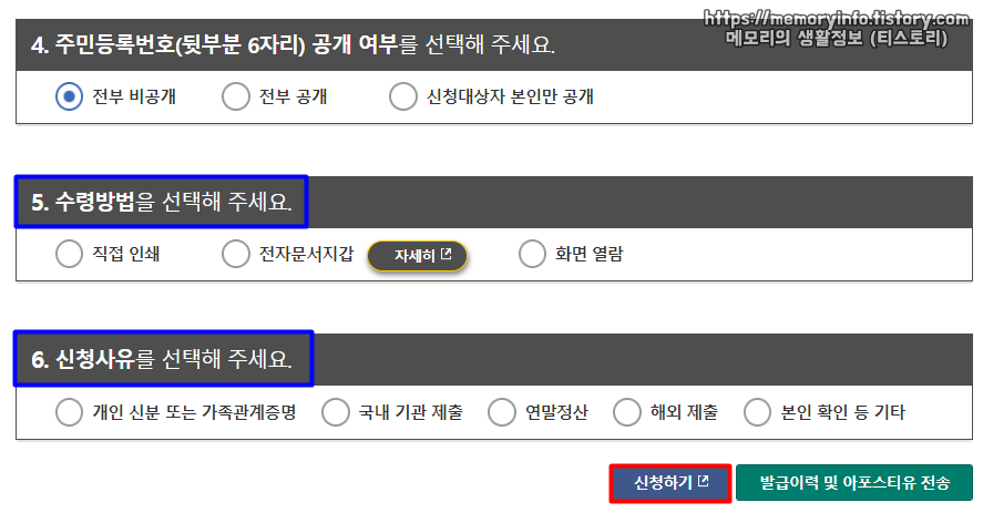 다음으로 주민등록번호 공개 여부, 증명서 수령 방법, 신청 사유를 선택해줍니다. 만약 PDF 파일 저장 또는 프린터 인쇄를 원한다면 수령 방법을 '직접 인쇄'로 선택해줍니다.