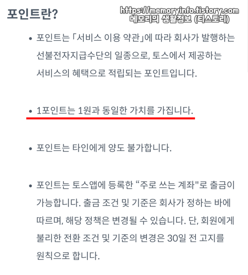 토스 포인트는 토스 내에서 적립해서 사용할 수 있는 포인트로 토스 포인트 1원은 현금 1원과 동일한 가치를 가지는 것입니다.