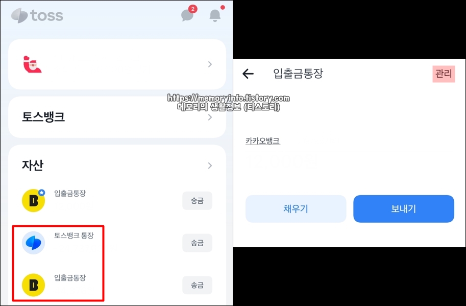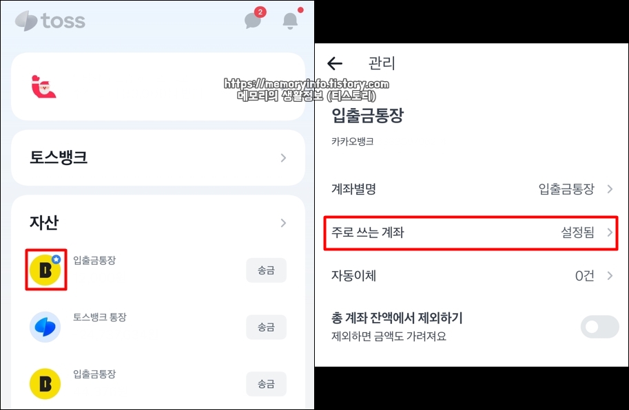 토스 주로 쓰는 계좌 설정은 "자산 > 계좌 > 관리"에서 가능합니다.