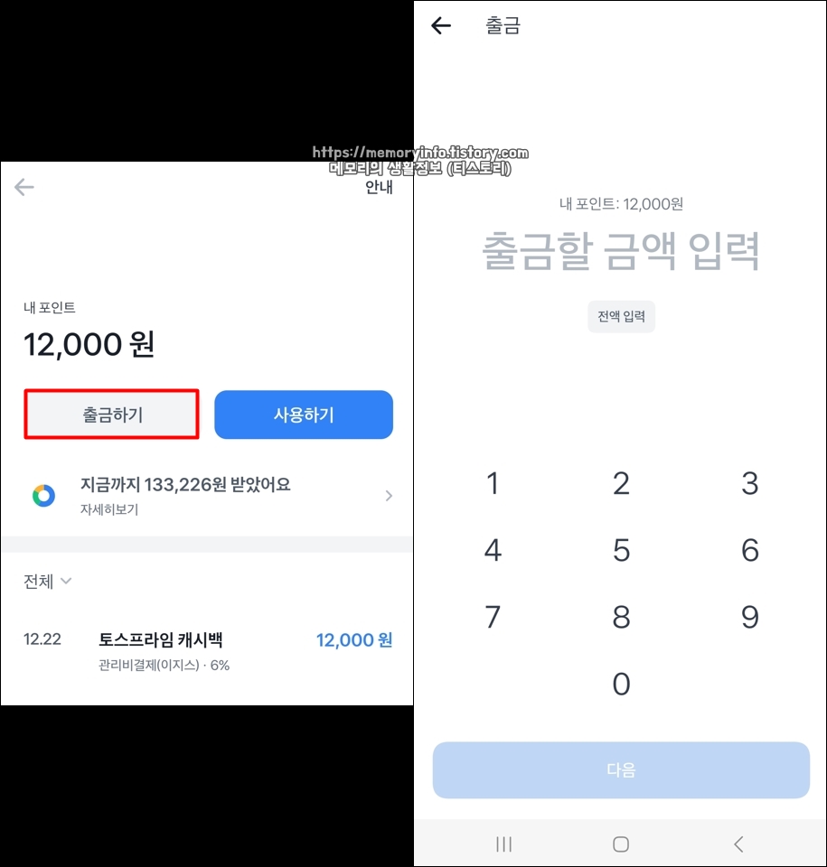 적립된 포인트를 확인한 후, 아래에 보이는 출금하기 버튼을 눌러줍니다. 그리고 이어서 출금할 금액을 입력해줍니다.