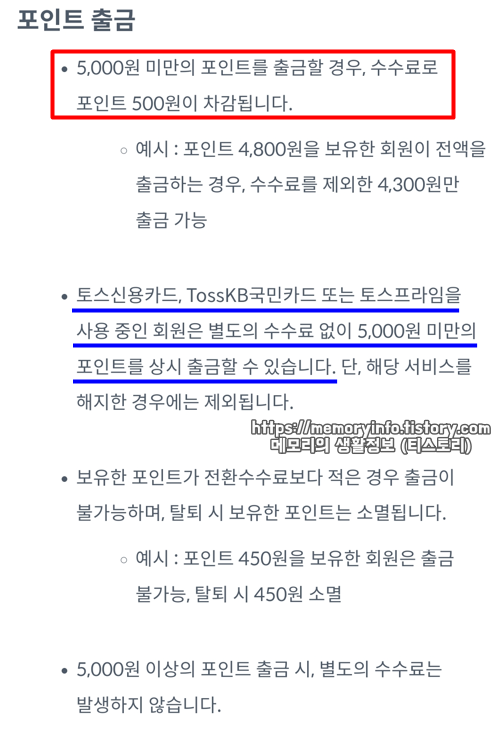 토스 포인트 출금 수수료는 5천원 미만 포인트 출금 시 500원입니다. 그러나 토스 신용카드를 사용하거나 토스프라임 유료 멤버십 회원이라면 별도의 출금 수수료 없이 5천원 미만의 포인트도 무료 출금이 가능합니다.