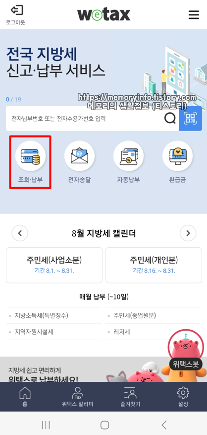 로그인 후, 메인 화면에 보이는 조회 및 납부를 눌러줍니다.