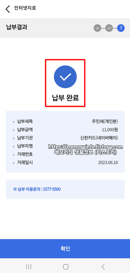 주민세 납부를 완료한 모습입니다. 주민세는 아시다시피 카드 결제가 가능하고, 카드 결제 수수료가 없다는 장점이 있습니다. (홈택스에 내는 세금은 카드 결제 시 카드 결제 수수료가 붙음)