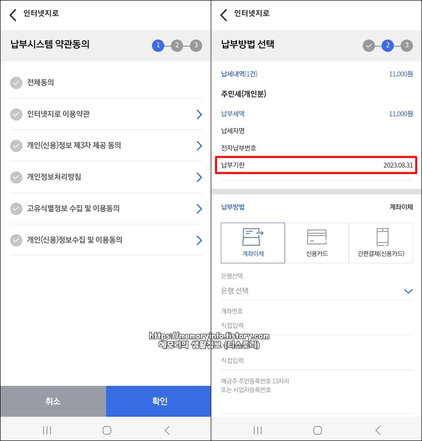 납부시스템 약관에 동의한 후, 확인 버튼을 눌러줍니다. 그리고 이어서 납부방법(계좌이체, 신용카드, 간편결제)을 선택해줍니다.