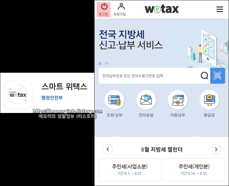 주민세는 1년에 1번 8월에 납부해야 하며, 주민세 납부는 인터넷(위택스 홈페이지) 또는 모바일(스마트 위택스 앱)을 통해 가능합니다. 저는 이번에 모바일 앱을 통해 납부해보도록 하겠습니다. 스마트 위택스 앱을 실행한 후, 로그인해줍니다.